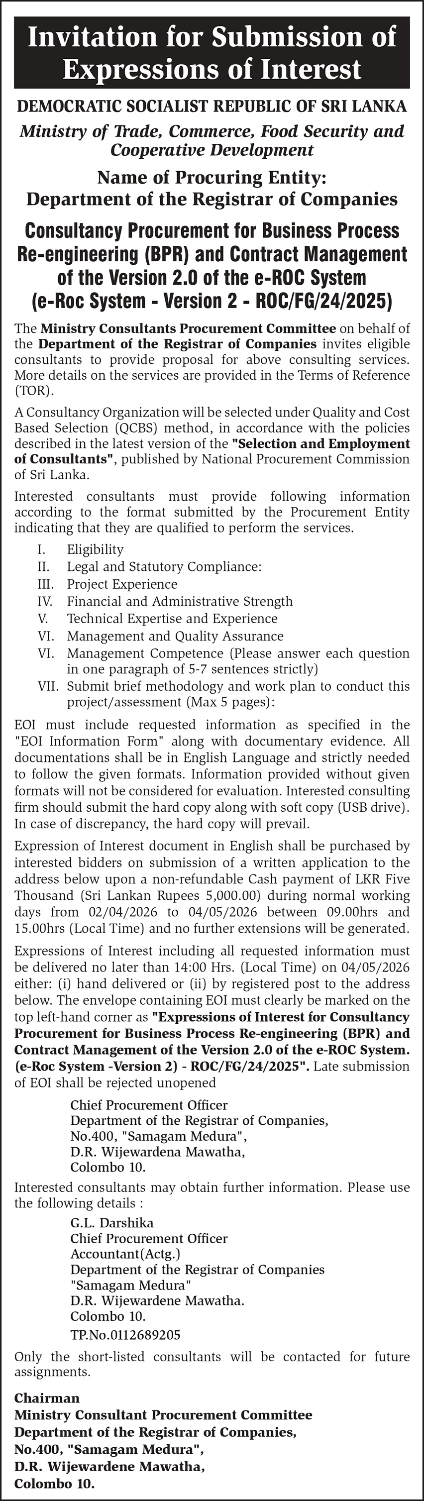 Department of the Registrar of Companies, Ministry of Trade, Commerce, Food Security and Cooperative Development Deadline : 04/05/2026
